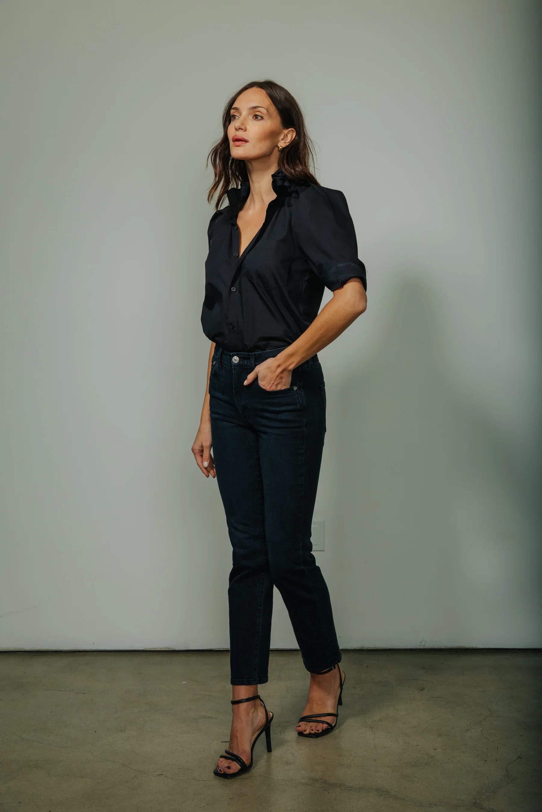 A sleek black staple with that KMJ cool factor. Pair it with trousers for a clean monochrome vibe, or let it anchor a statement jacket. It’s the kind of piece that makes you feel like you have an editorial assistant just out of frame.