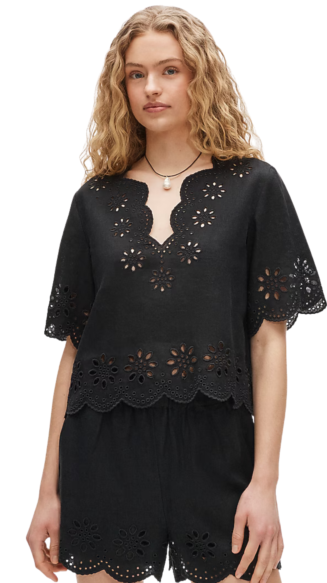 The definition of throw-on-and-go. Crisp white linen with delicate embroidery—perfect with relaxed trousers or a tailored short.