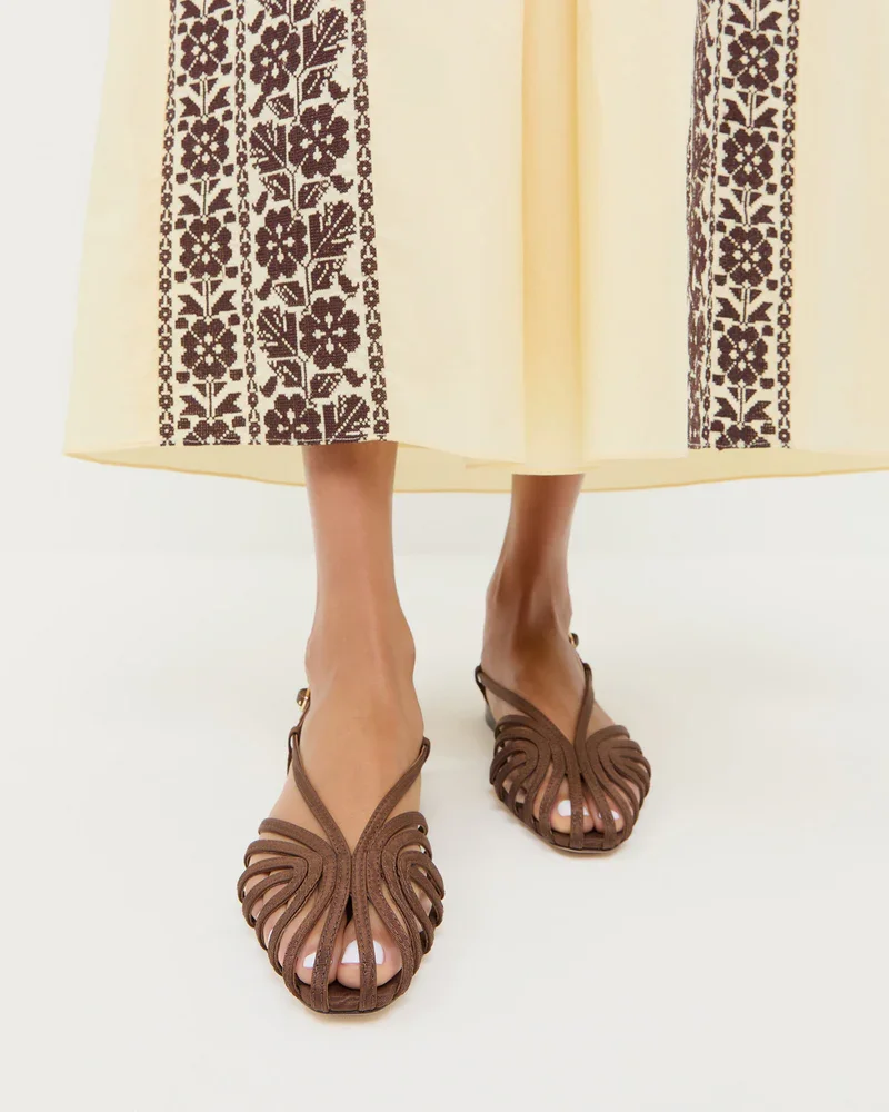 On the shoe front, I’m torn in the best way. The Devon Chocolate Moiré Slingback Sandals by Loeffler Randall add polish with a subtle sheen